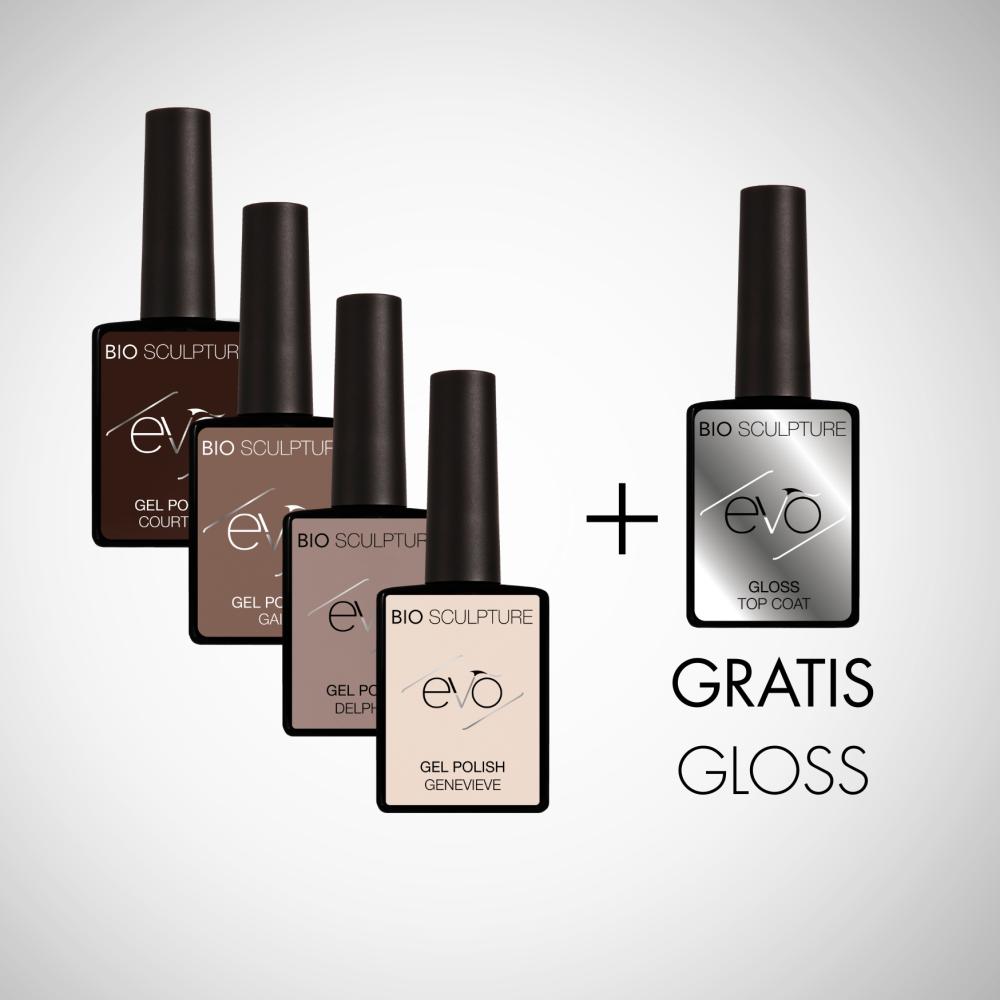 4 elegante EVO-Gelfarben. 1 EVO Gloss Top Coat gratis. Nur zur Mocha Week.